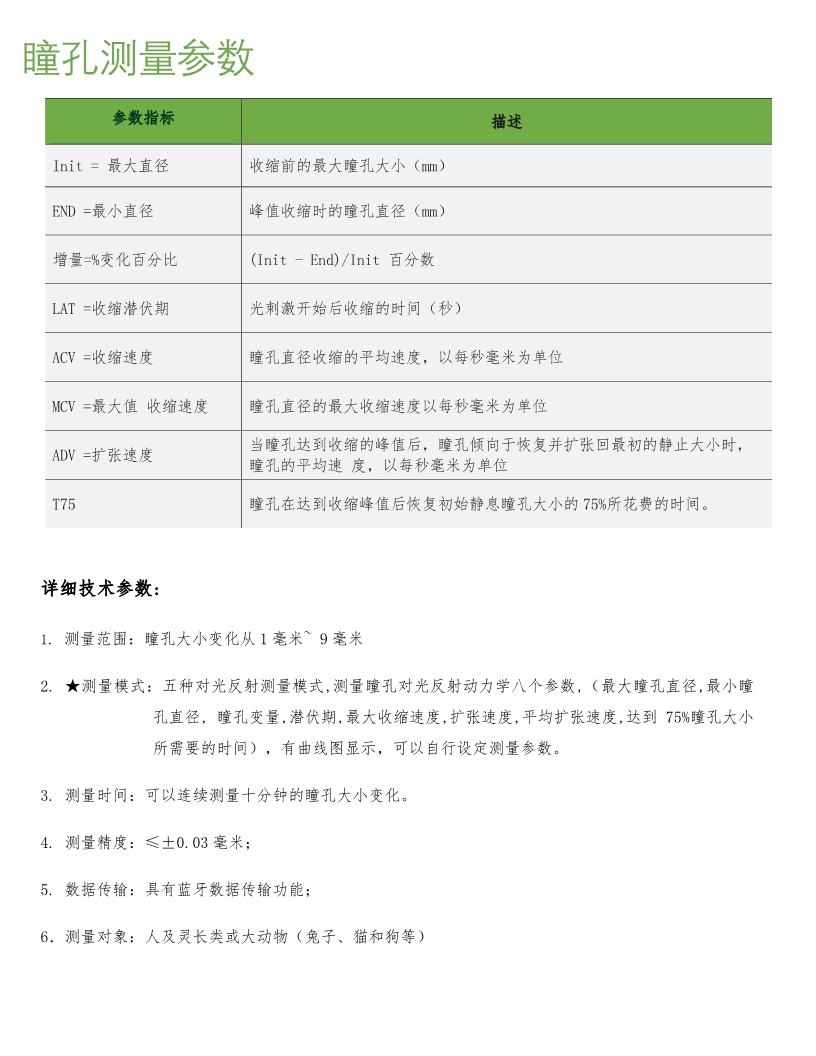 全球领先的大学,制药公司和合同研究组织的研究人员使用全球领先的大学,制药公司和研究组织的研究人员使用•快速准确地测量瞳孔大小和瞳孔光反射易于使用和操作•一键激活•无需校准•便携式,电池供电的手持式设备•耐用的人体工学设计